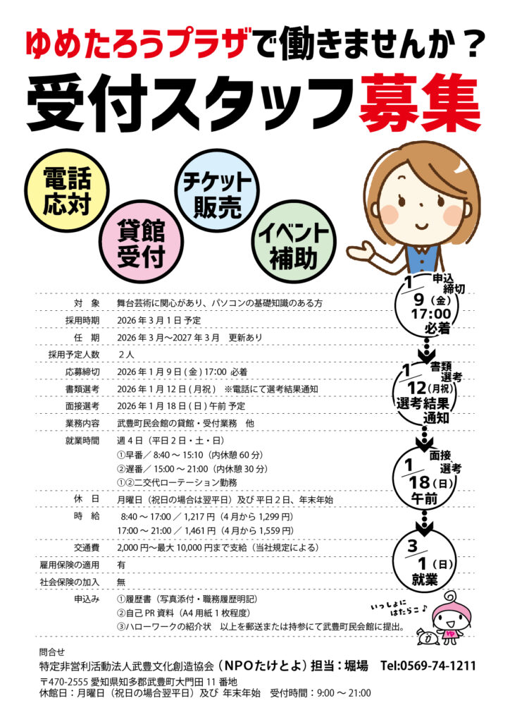 申込み:①履歴書(写真添付・職務履歴明記)②自己PR資料(A4用紙1枚程度)③ハローワークの紹介状 以上を郵送または持参にて武豊町民会館に提出。