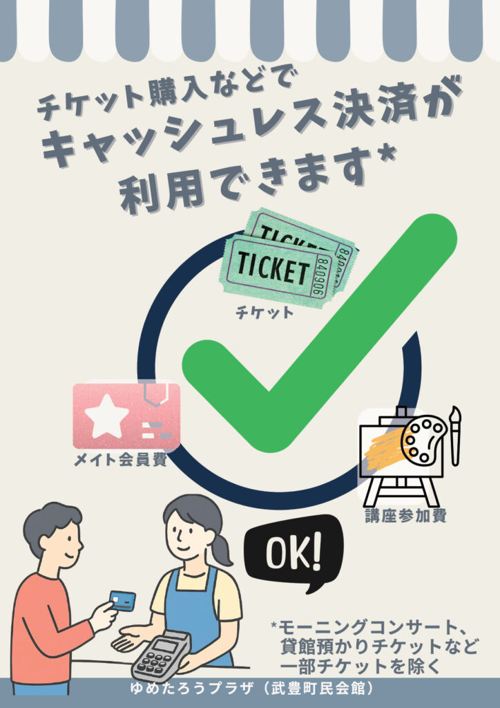ゆめプラ窓口にてキャッシュレス決済を利用できる範囲が拡大します 武豊町民会館(ゆめたろうプラザ)では令和8年4月1日(水)から、従来の貸館使用料・備品使用料に加え、チケット購入などでクレジットカード・電子マネー・QRコードなどのキャッシュレス決済でお支払いできるようになりました。決済可能な支払方法については、下記のチラシをご確認ください。 ※モーニングコンサート、貸館預かりチケットなど一部のチケットを除く