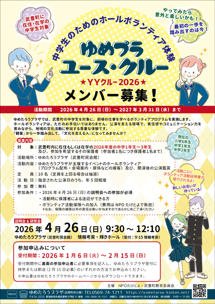 ゆめたろうプラザでは、武豊町の中学生を対象に、劇場の仕事を学べるボランティアプログラムを実施します。